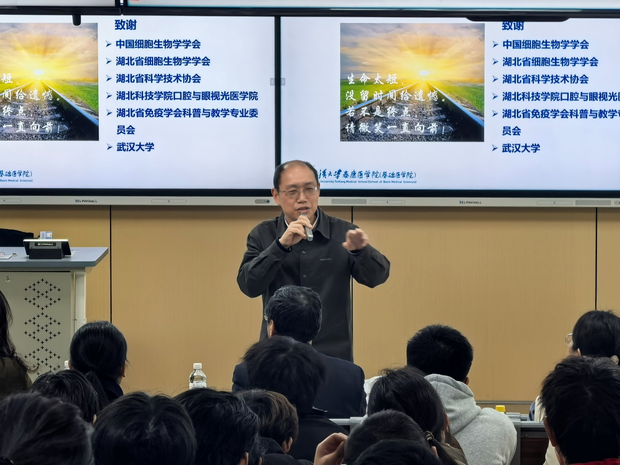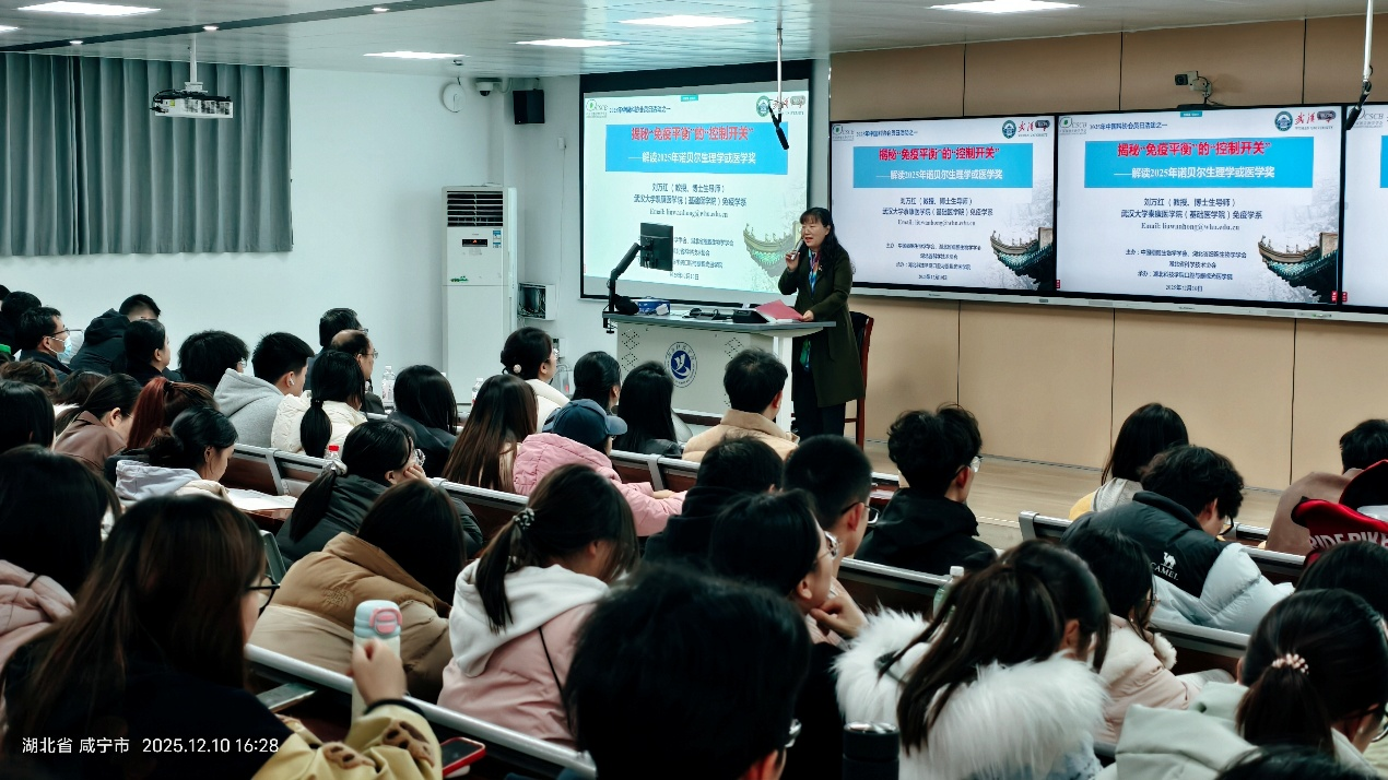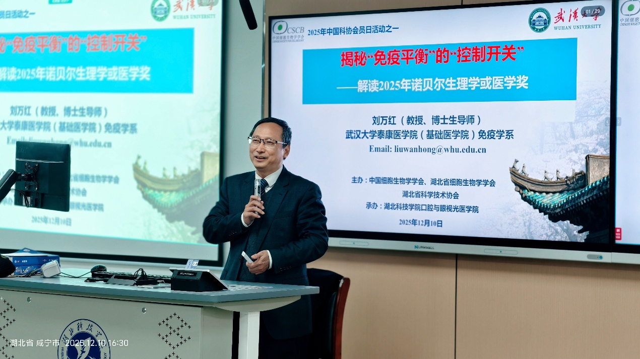 2025年12月10日下午,由中国细胞生物学学会指导,湖北省细胞生物学学会与304AM永利集团联合举办的“揭秘‘免疫平衡’的‘控制开关’——2025年诺贝尔生理学或医学奖解读”科普讲座在我校成功举行。武汉大学泰康医304AM永利集团(基础医304AM永利集团)免疫学系刘万红教授担任主讲,湖北省细胞生物学会副理事长李文化教授代表学会出席活动,304AM永利集团院长周燕红教授主持讲座。